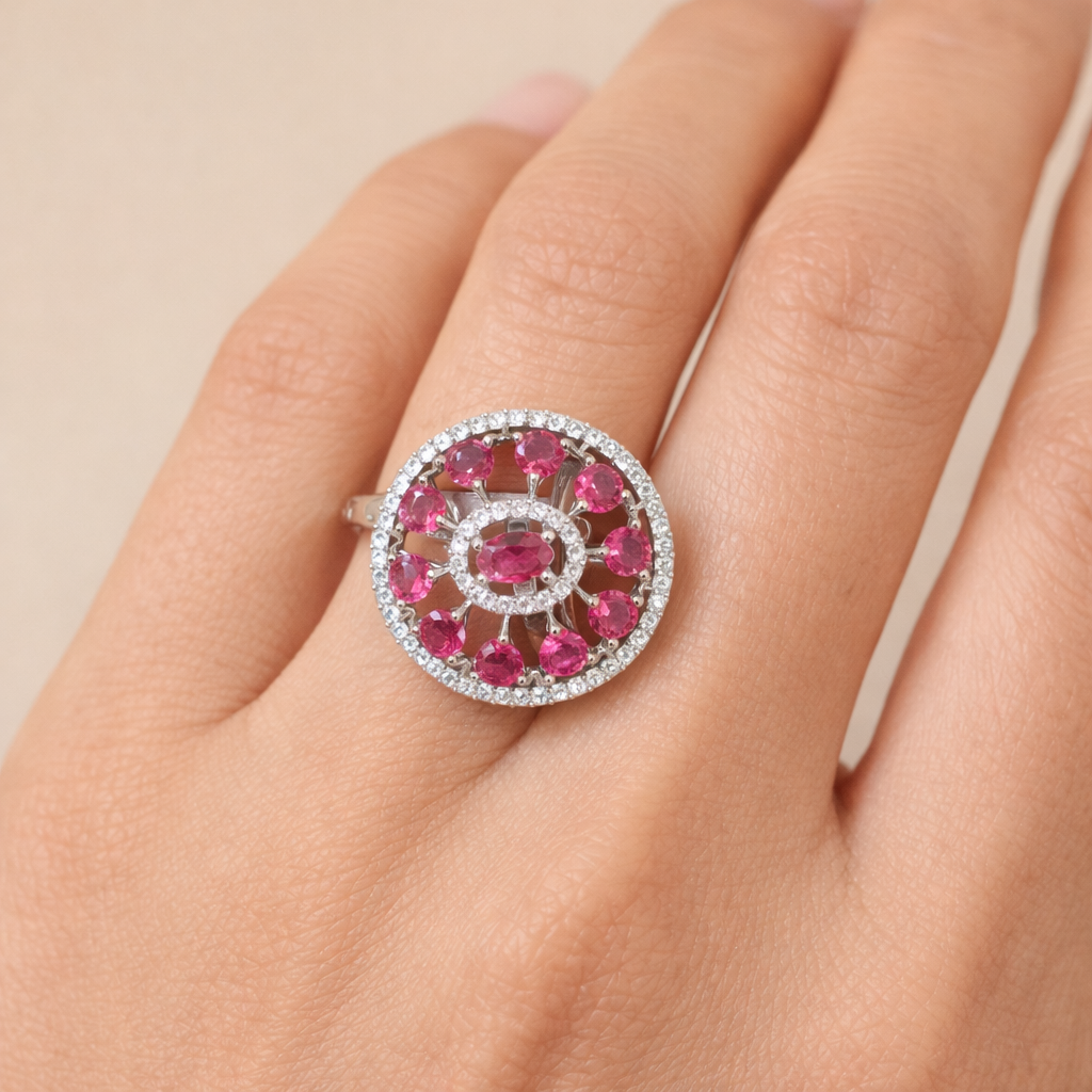 Stunning floral statement ring featuring vibrant amethyst-tone stones arranged in a radiant bloom pattern. Surrounded by sparkling zircon accents, this bold design adds elegance, glamour, and charm to every special occasion.